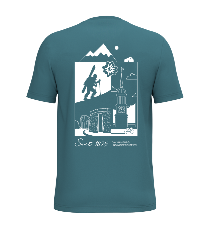 Umweltfreundliches Unisex T-Shirt aus 100% Bio-Baumwolle (350 g/m²) von Native Spirit® (NS300). Mit großem Rückenprint, der die Berge, Hochtouren, Hamburg und unser DAV Kletterzentrum in Kombination nach außen trägt. Auf der Brust ist das offizielle Logo unser Sektion zu finden.